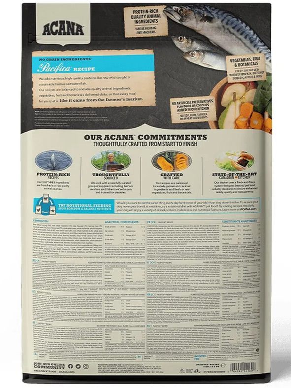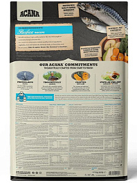 Корм ACANA Pacifica Dog содержит выловленную на воле сельдь, сардины, камбалу, серебристого хека и морского окуня. Все ингредиенты доставляются свежими или сырыми с острова Ванкувер и в полной мере отражают природный рацион. Корм содержит мало углеводов, зато богат рыбным белков для поддержания отличной физической формы.