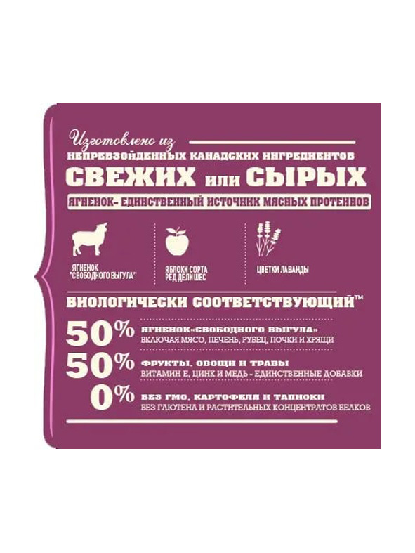 Корм ACANA Grass - Fed Lamb с одним источником белка на 50% состоит из мяса новозеландского ягненка, которое доставляется на фабрику сырым и используется в соотношении WholePrey («добыча целиком»). Включенная в состав сублимированная печень привлечет даже привередливых питомцев. А клетчатка, содержащаяся в свежих яблоках, мускатной и столовой тыквах, наладит чувствительное пищеварение.