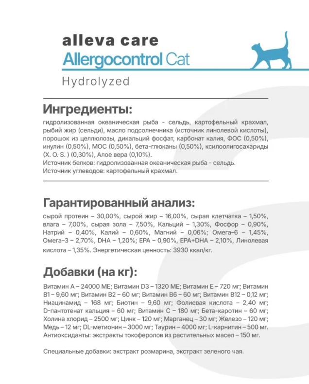 Для ограничения реакций иммунной системы в корме Alleva Care Allergocontrol в качестве единственного источника белка используется гидролизованная сельдь с низким молекулярным весом (70% ниже 2 000 дальтон, максимально 6 000 дальтон), а в качестве углеводов используется картофельный крахмал, прошедший тщательную очистку от белковой составляющей.