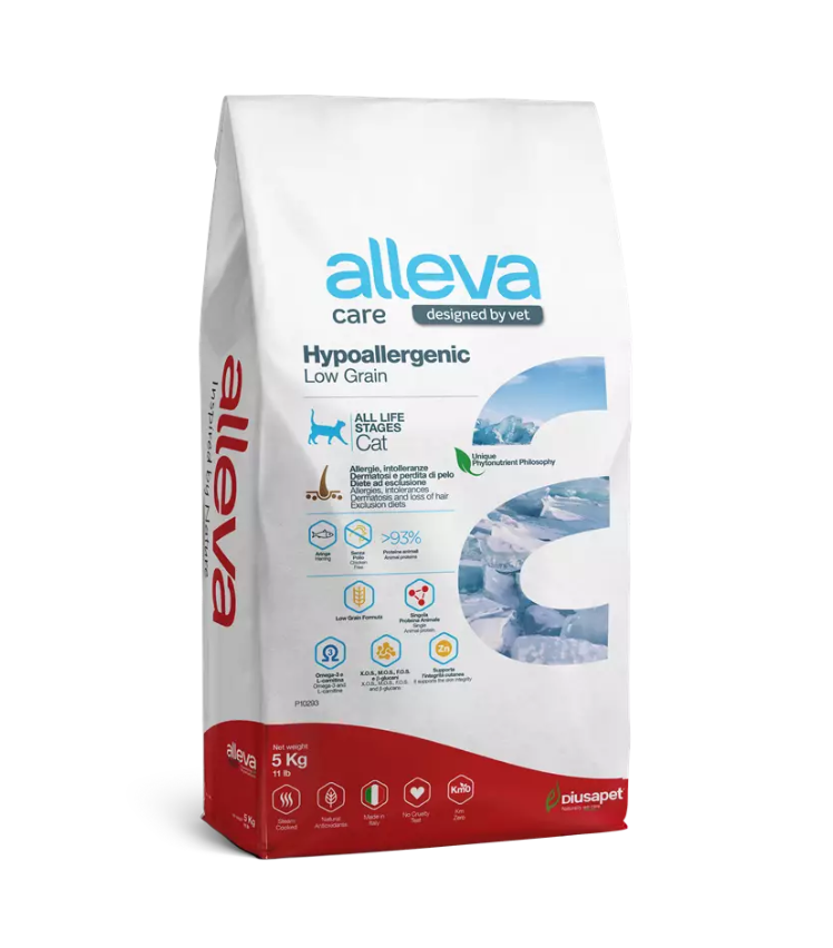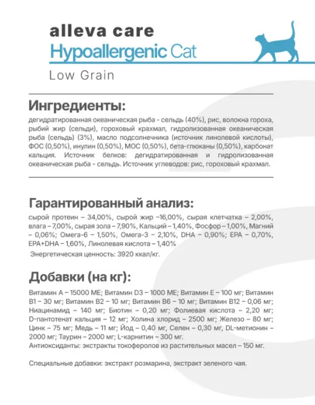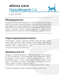Единственным источником белка в Alleva Care Hypoallergenic Low Grain является дико выловленная сельдь, а в качестве источника углеводов используются высоко усваиваемый рис и гороховый крахмал, очищенные от белковой составляющей. Высокая концентрация незаменимых жирных кислот (линолевая кислота, эйкозапентаеновая кислота (EPA) и докозагексаеновая кислота (DHA)) из жира сельди и масла подсолнечника поддерживает здоровье кожи.