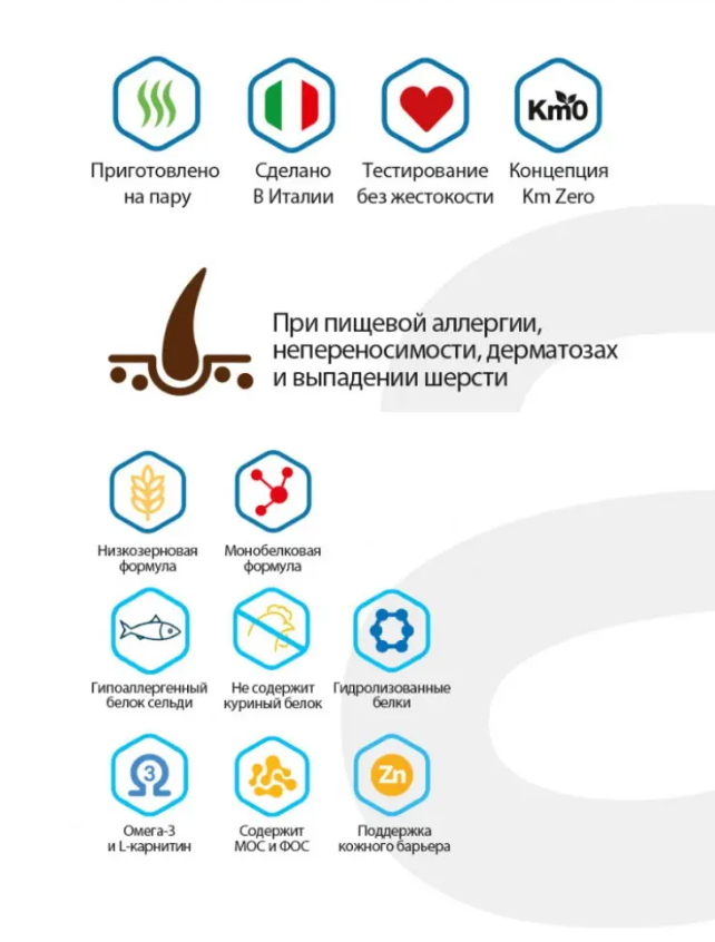 Состав: Дегидратированная океаническая рыба – сельдь (40 %), рис, волокна гороха, рыбий жир (сельди), гороховый крахмал, гидролизованная океаническая рыба (сельдь) (3 %), масло подсолнечника (источник линолевой кислоты), фруктоолигосахариды (ФОС) (0,50%), инулин (0,50 %), маннанолигосахариды (МОС) (0,50 %), бета-глюканы (0,50 %), карбонат кальция. Источник белков: дегидратированная океаническая рыба – сельдь, гидролизованная океаническая рыба - сельдь. Источник углеводов: рис, гороховый крахмал.
