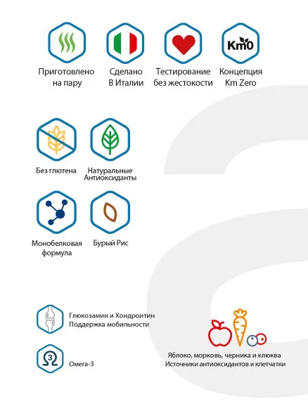 Дополнительно формула кормов обогащена таурином и L-карнитином для поддержания работы основных систем организма, а также хондроитином и глюкозамином для здоровья суставов.