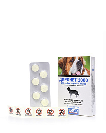 Диронет® 1000 предназначен для собак крупных пород, содержит в одной таблетке пирантела памоат 450 мг, празиквантела 150 мг и ивермектина 0,18 мг. Доза - 1 таблетка на 30 кг массы тела животного.