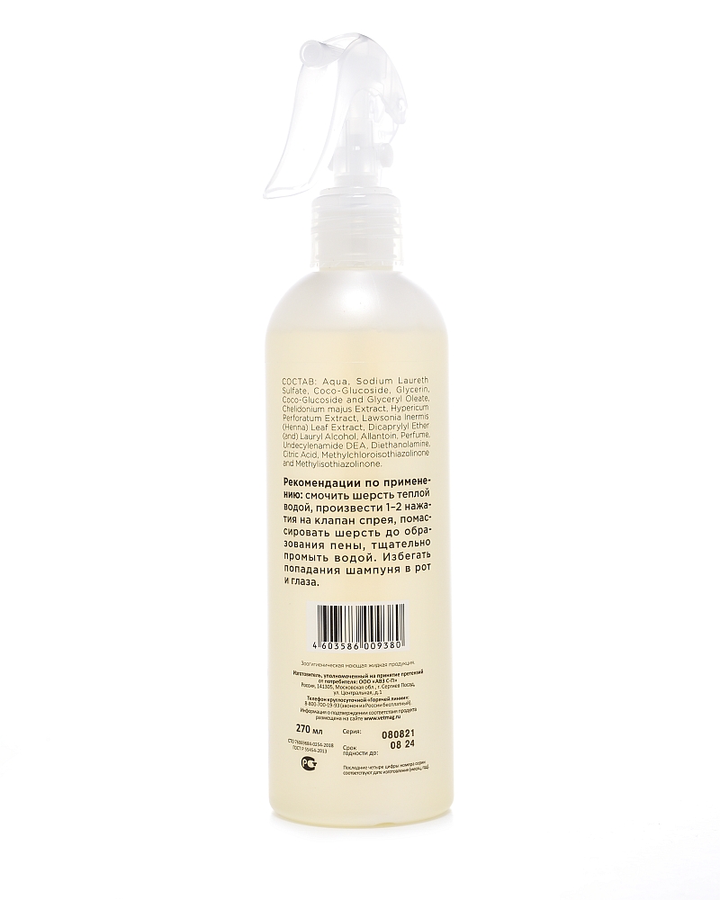 Спрей-шампунь содержит натуральные экстракты чистотела, хны, зверобоя, противогрибковые компоненты, аллантоин. Сочетание мягкого моющего комплекса, натуральных экстрактов трав и аллантоина позволяет эффективно отмывать шерсть, не пересушивая ее. Шампунь идеально под- ходит для ежедневного применения после кормления, легко удаляет жир и остатки пищи с волос и кожи. Частое использование шампуня предотвращает развитие грибковых заболеваний, смягчает эпидермис, снимает зуд, восстанавливает и укрепляет шерсть, способствует легкому расчесыванию.