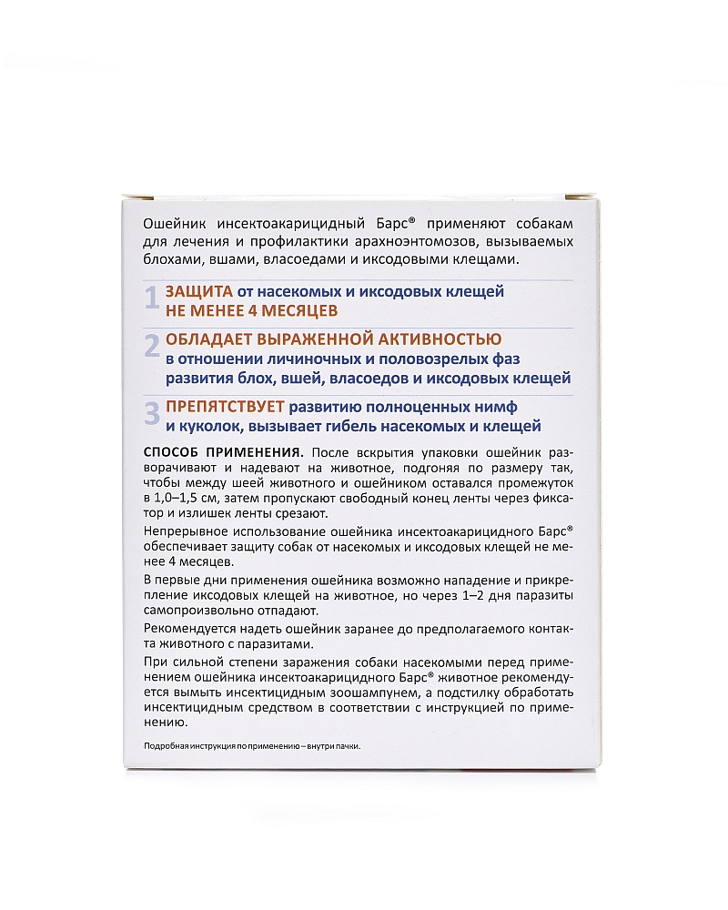 Непрерывное использование инсектоакарицидного ошейника «Барс» обеспечивает защиту собак и кошек от блох, вшей, власоедов, иксодовых клещей до 4-х месяцев. В первые дни применения ошейника возможно нападение и прикрепление иксодовых клещей на животное, но через 1 день паразиты погибают и засыхают или самопроизвольно отпадают.