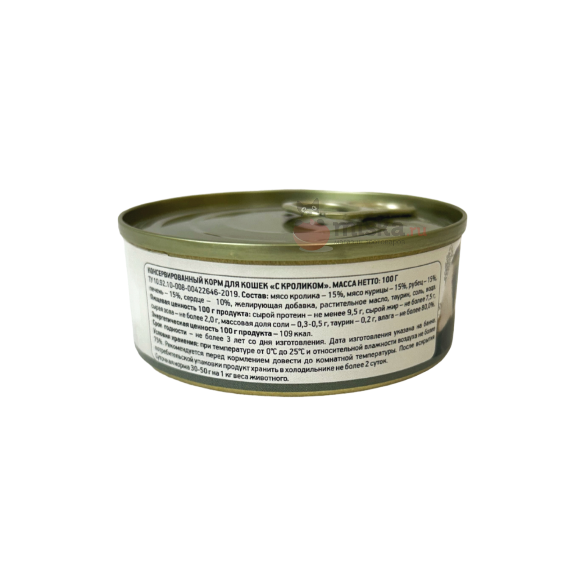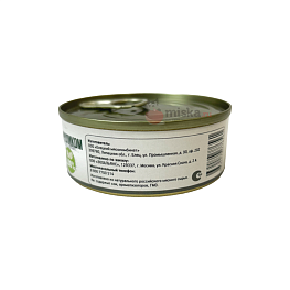 сырой протеин - не менее 9,5г, сырой жир - не более 7,5г, сырая зола - не более 2,0г, массовая доля соли - 0,3-0,5г, таурин - 0,2г, влага - не более 80,0%.