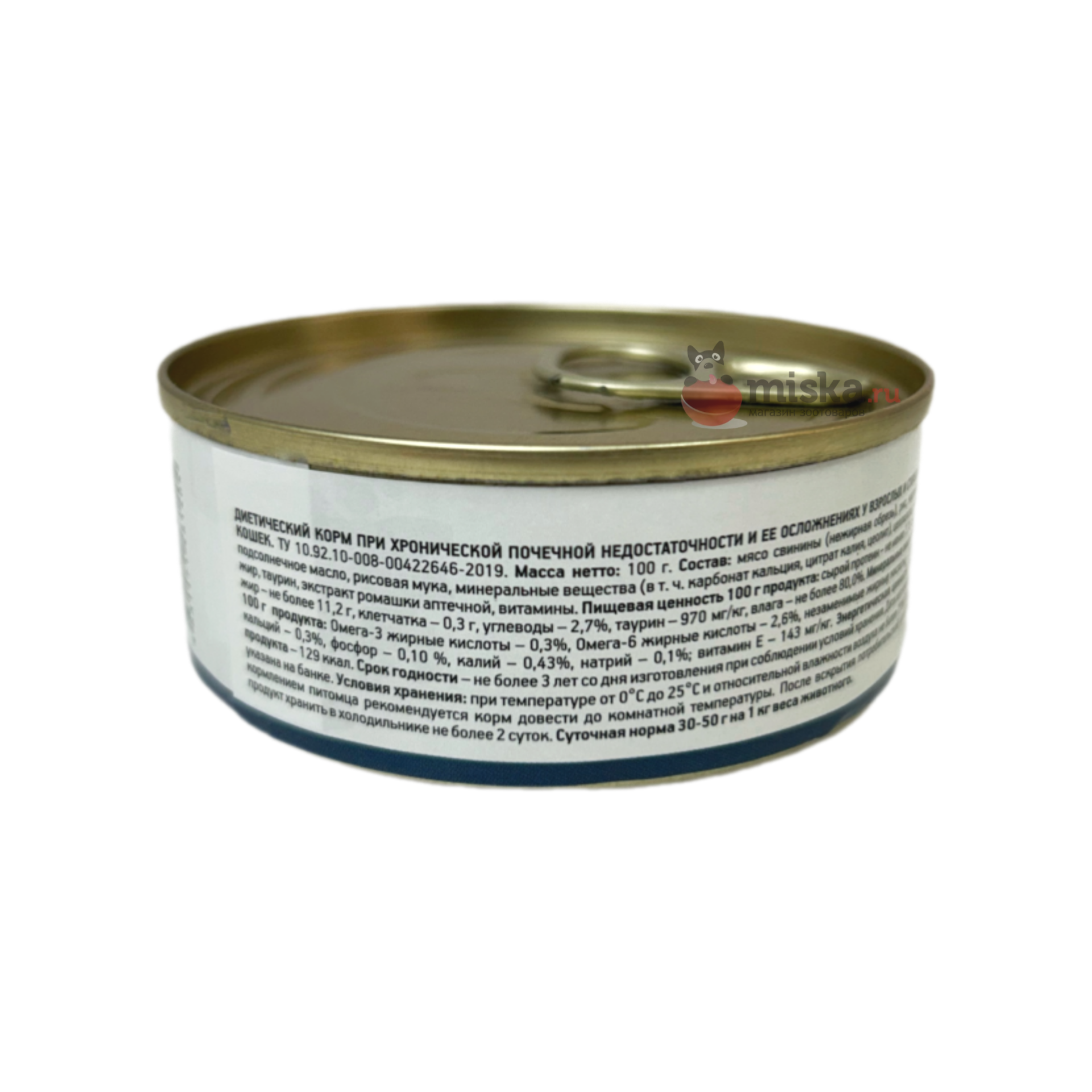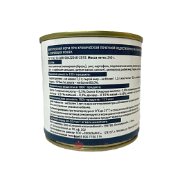 Питательная ценность 100г продукта: сырой протеин - не менее 7,3г; сырой жир - не более 11,2г; клетчатка - 0,3г; углеводы - 2,7%; таурин - 970мг/кг; влага - не более 80,0%.