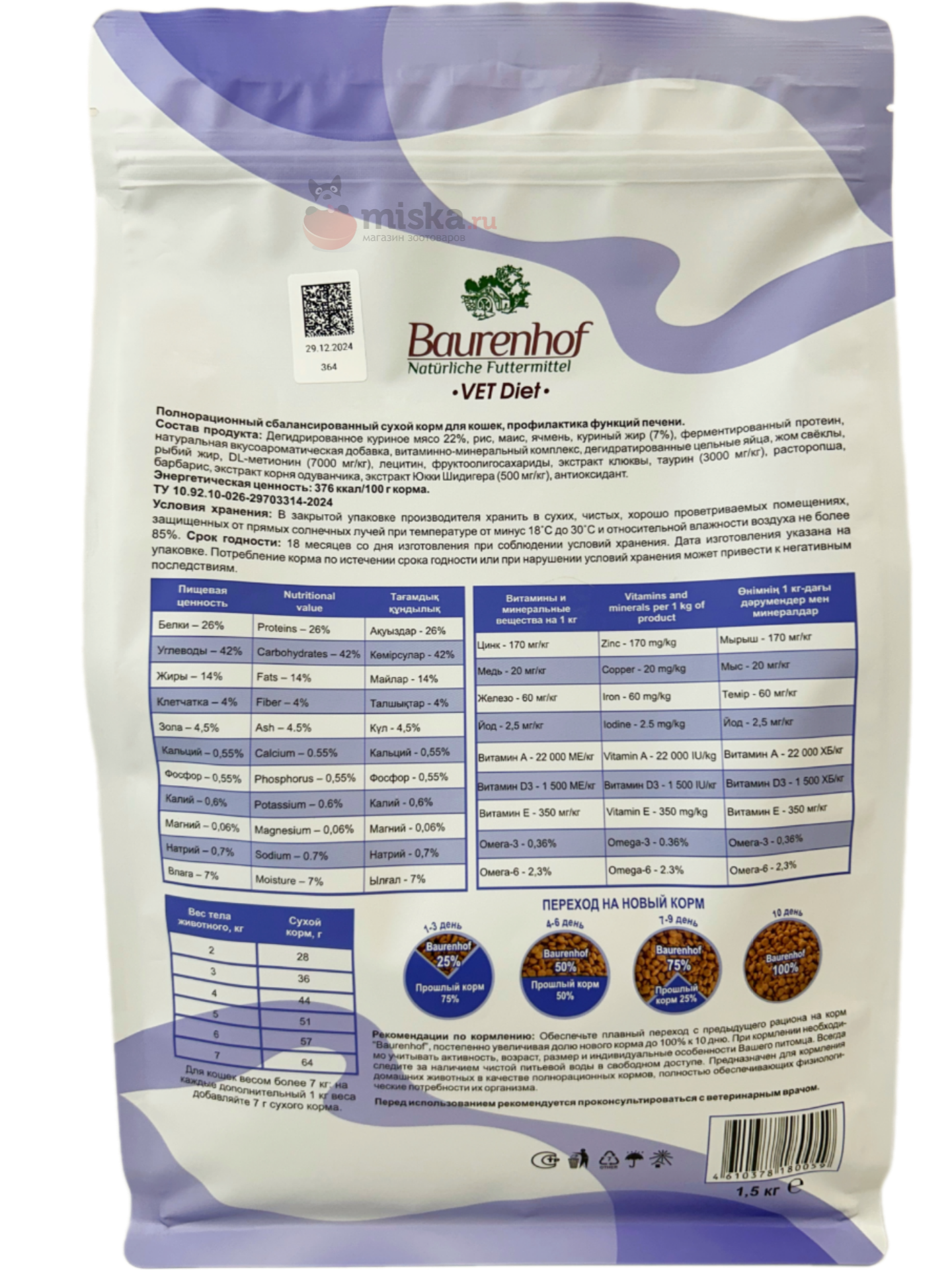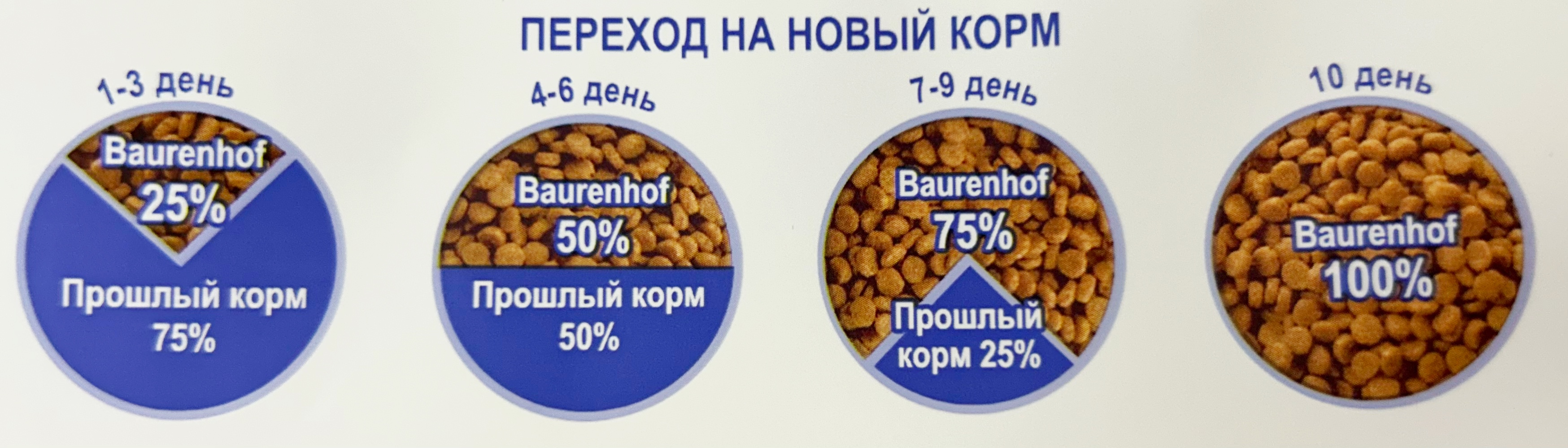 Рекомендации по кормлению: Обеспечьте плавный переход с предыдущего рациона на корм "Baurenhof", постепенно увеличивая долю нового корма до 100% к 10 дню. При кормлении необходимо учитывать активность, возраст, размер и индивидуальные особенности Вашего питомца.