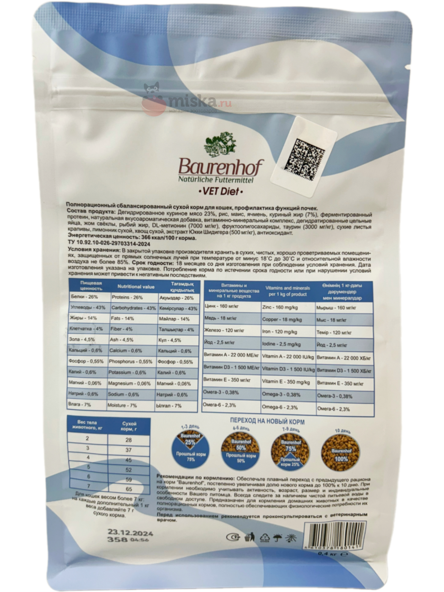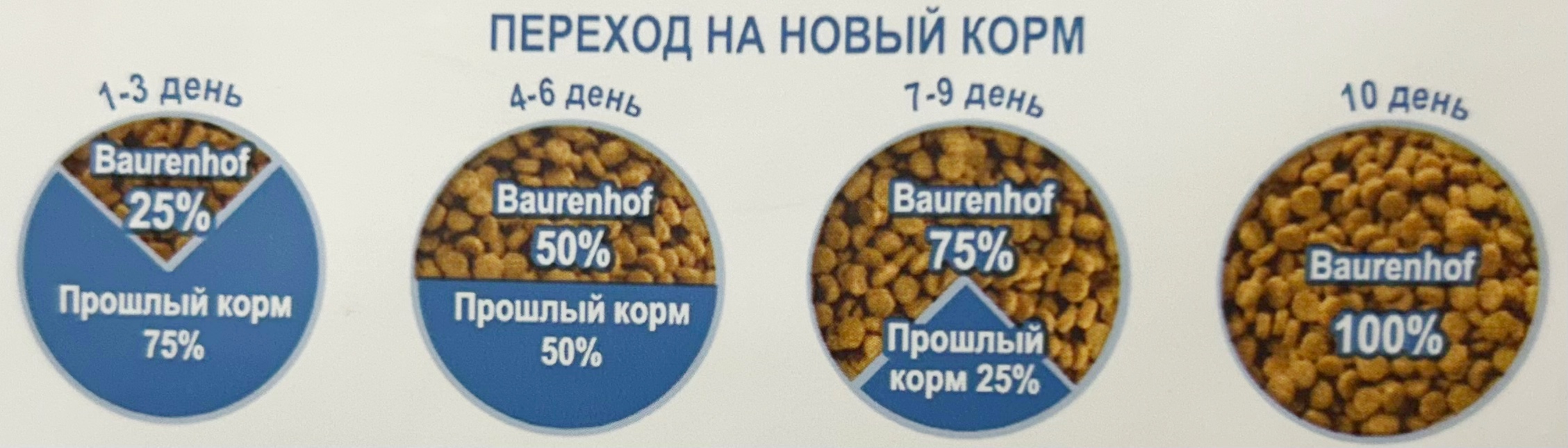 Рекомендации по кормлению: Обеспечьте плавный переход с предыдущего рациона на корм "Baurenhof", постепенно увеличивая долю нового корма до 100% к 10 дню. При кормлении необходимо учитывать активность, возраст, размер и индивидуальные особенности Вашего питомца.