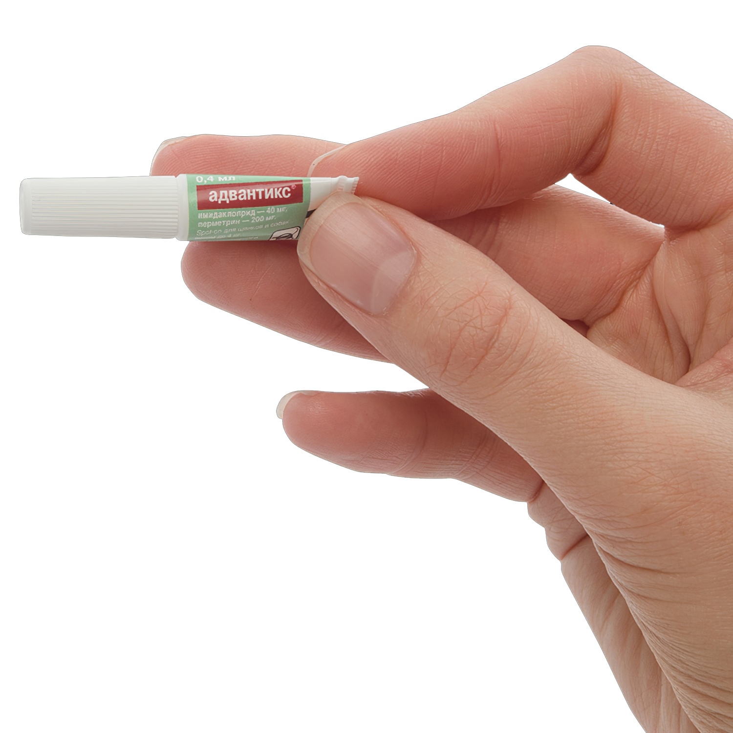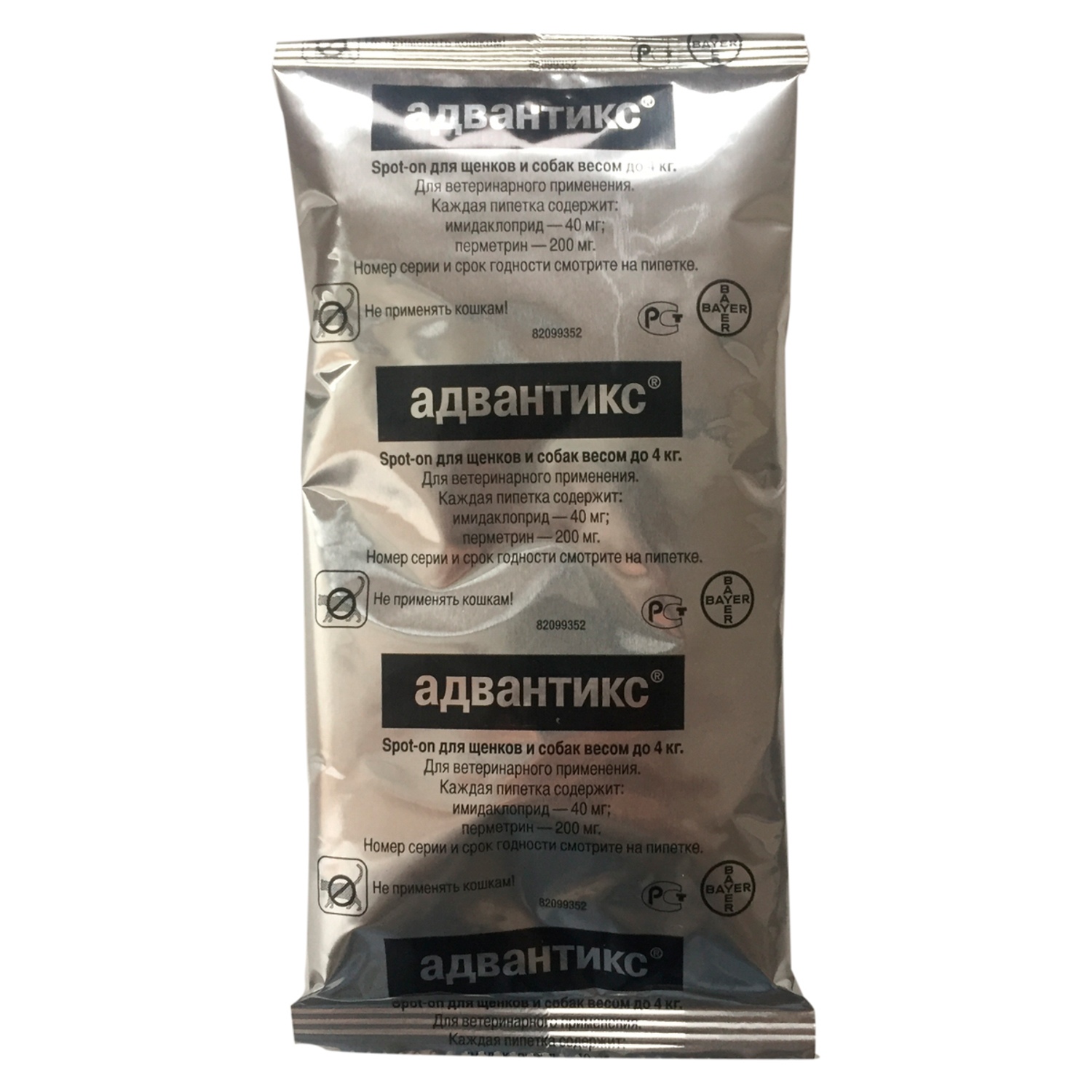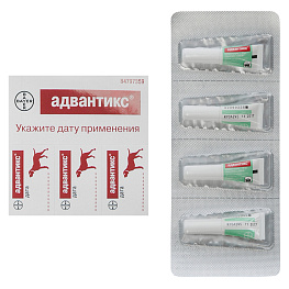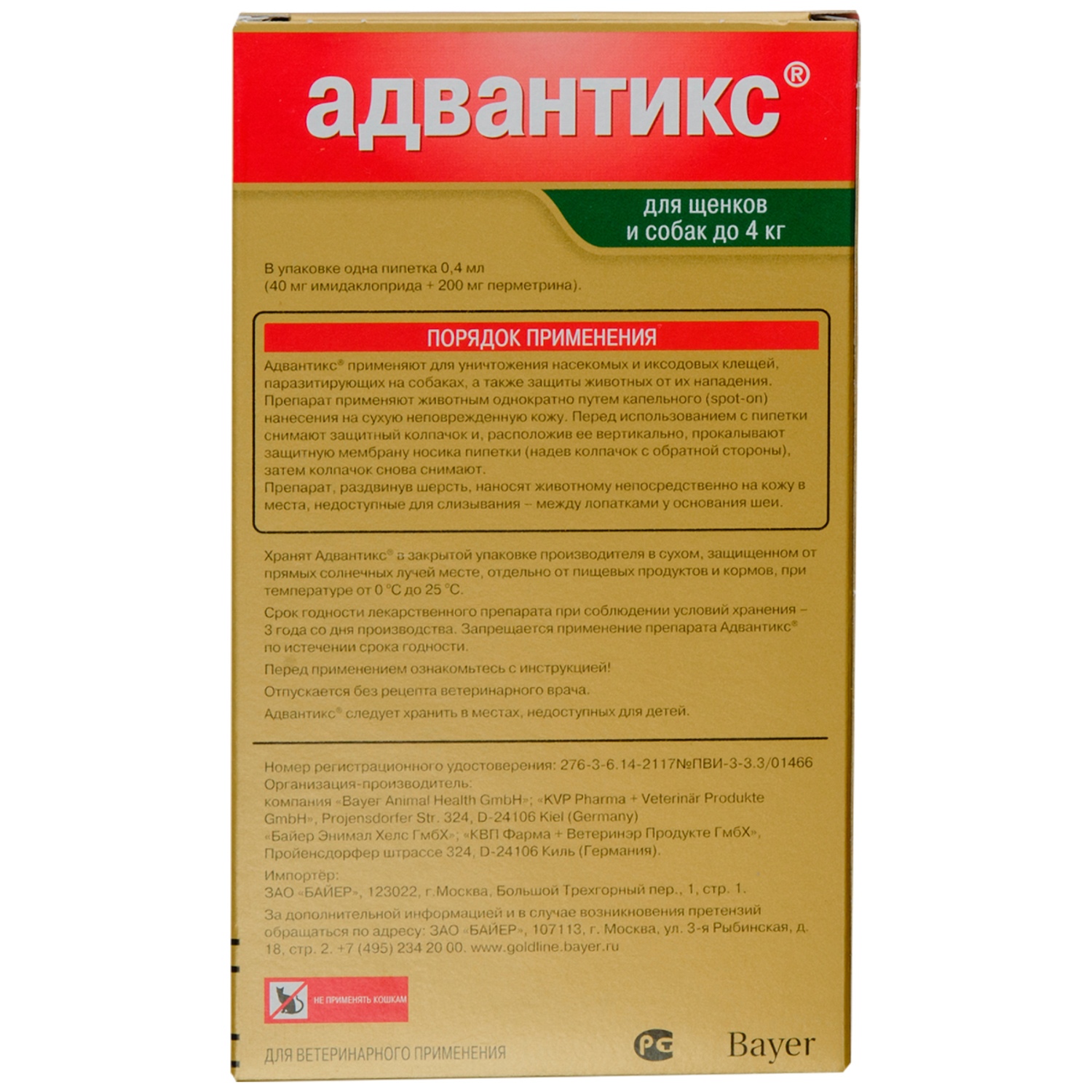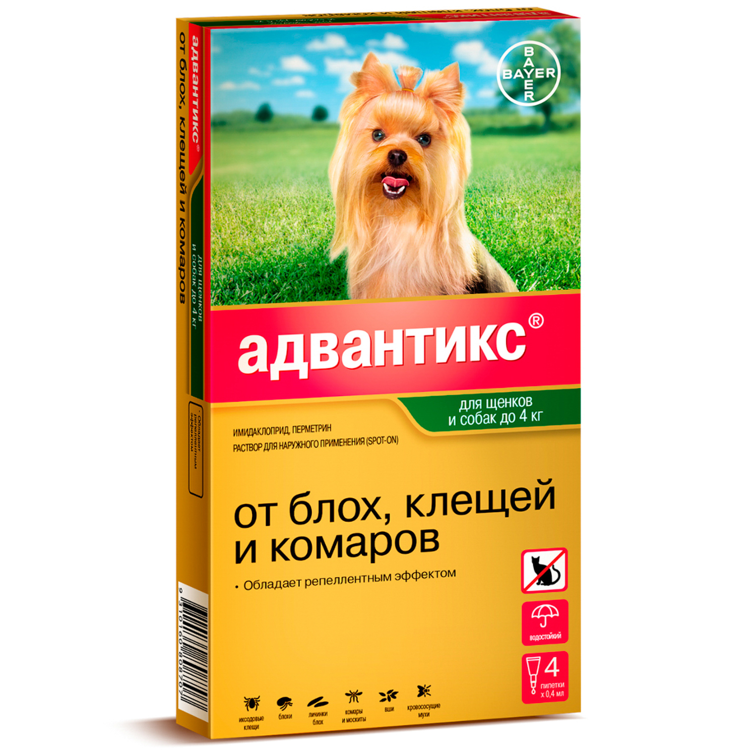 Адвантикс 40 С для собак до 4 кг (4 пипетки х 0,4 мл) применяют для уничтожения блох, вшей, летающих насекомых и иксодовых клещей, паразитирующих на собаках, а также для защиты животных от их нападения.