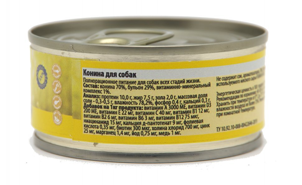 Состав: конина 70%, бульон 29%, витаминно-минеральный комплекс 1%.
