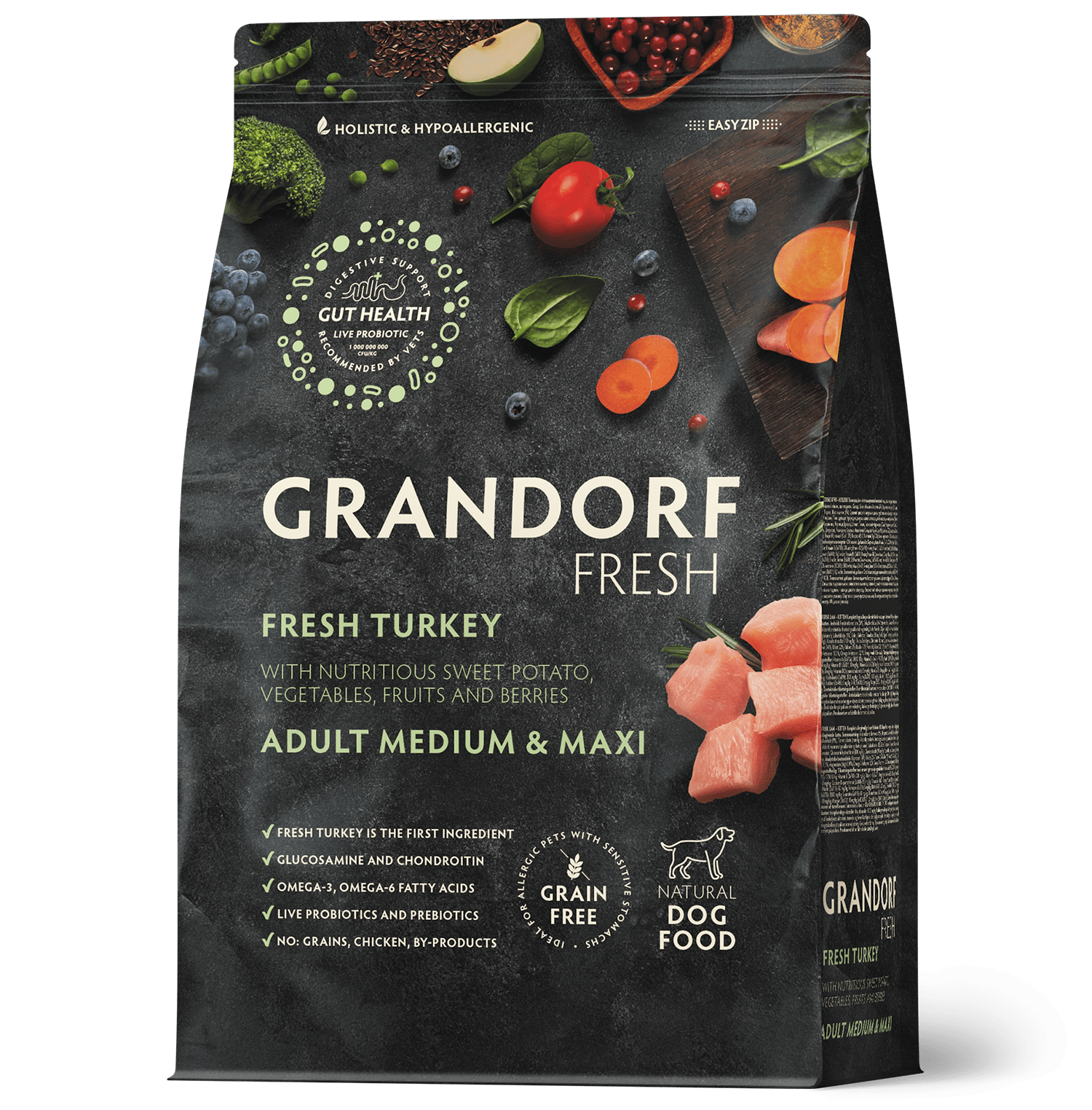 Живые пробиотики: Каждый рацион Grandorf Fresh содержит один миллиард живых и полезных пробиотиков на один килограмм корма. Пробиотики поддерживают микрофлору кишечника, помогают усвоению питательных веществ и укрепляют иммунитет. Пробиотики добавляются после производства в специальных кишечнорастворимых микрокапсулах, остаются живыми и выполняют свои функции: