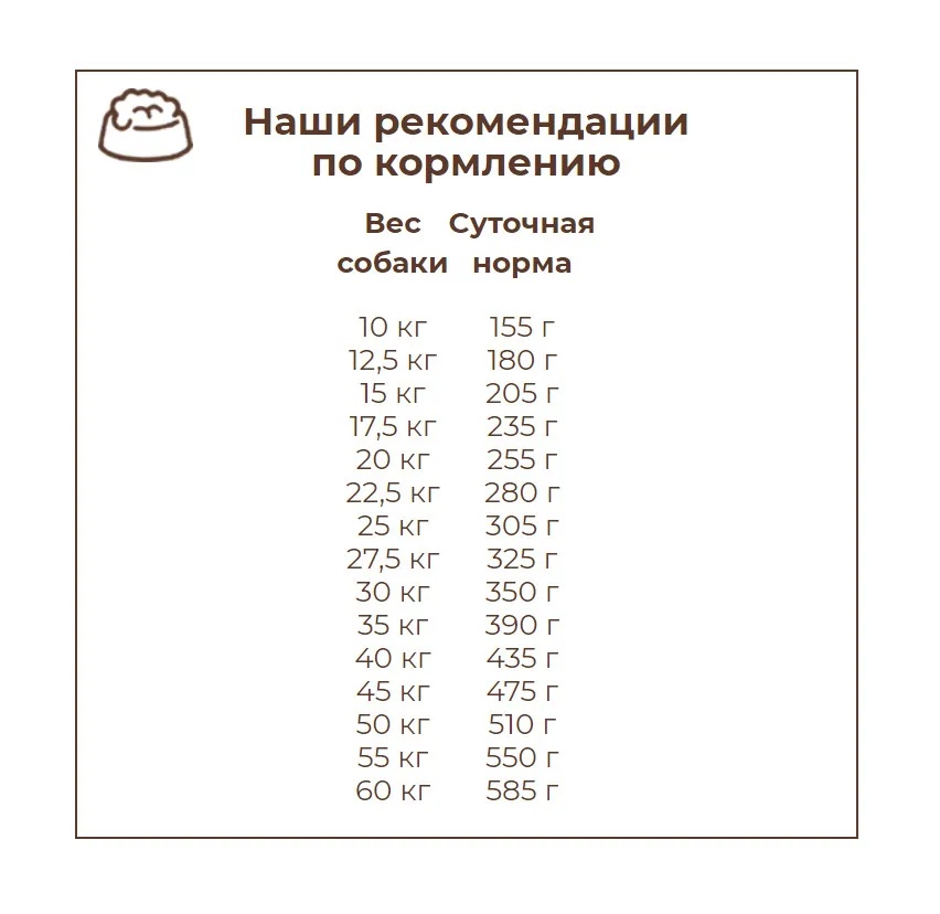 Индивидуальные потребности зависят от таких факторов, как возраст, порода, уровень активности и условия содержания вашего питомца. Если уровень активности вашего питомца повышен, пожалуйста, увеличьте количество корма соответственно.