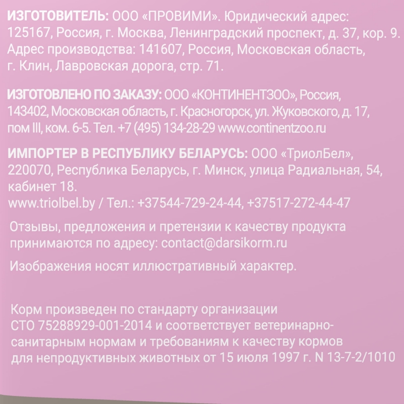 - Комплекс витаминов и минералов (А, В4, Д3, Е, В3, С, В1, В5, В2, В6, В9, К3, В7, В12 калий, железо, цинк, марганец, медь, йод, селен) способствует быстрому обновлению шерсти в период сезонной линьки, повышению активности иммунитета.