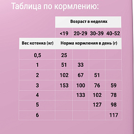Питательные добавки: Витамин А 24000 МЕ/кг, Витамин Д3 2000 МЕ/кг, Витамин Е 110 мг/кг, таурин 1000 мг/кг.