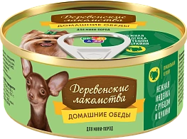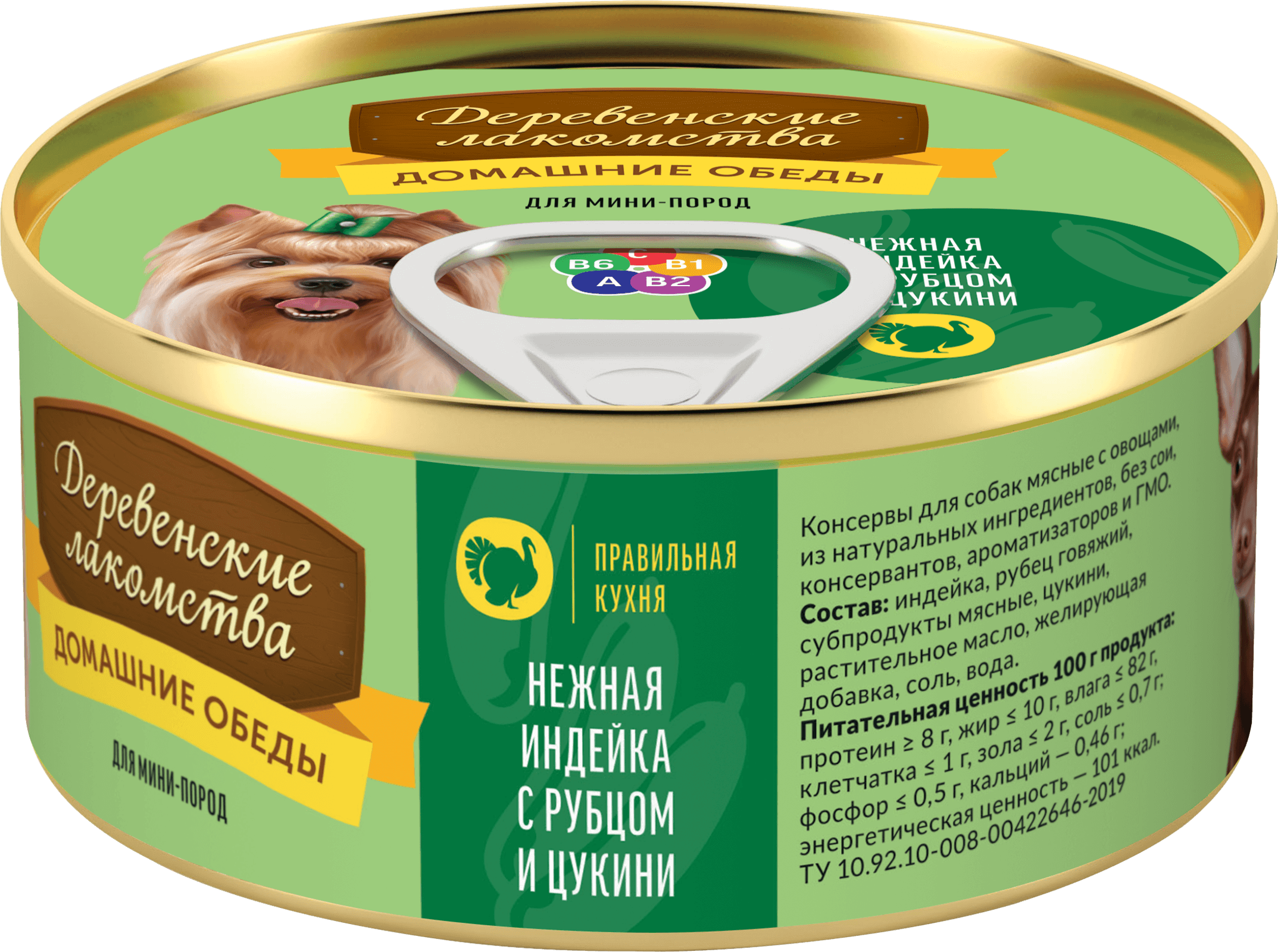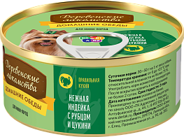 Состав: индейка, рубец говяжий, субпродукты мясные, цукини, растительное масло, желирующая добавка, соль, вода.