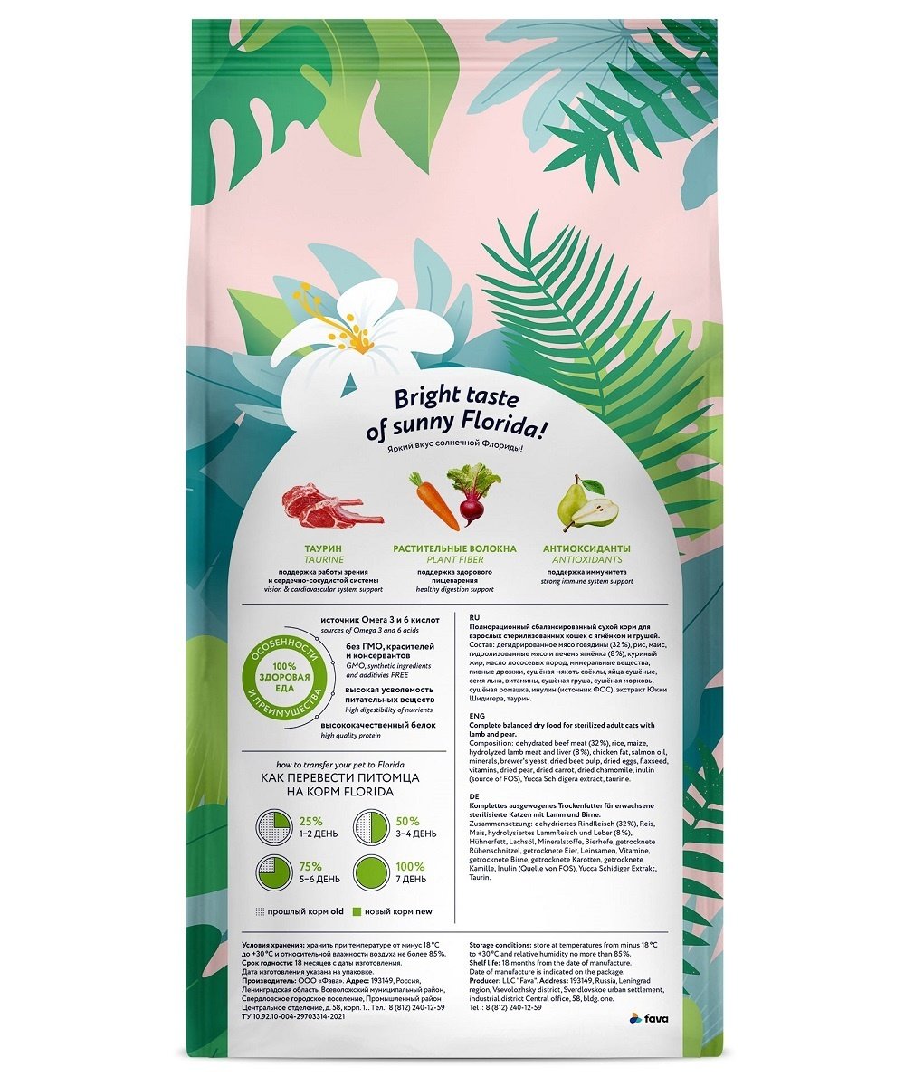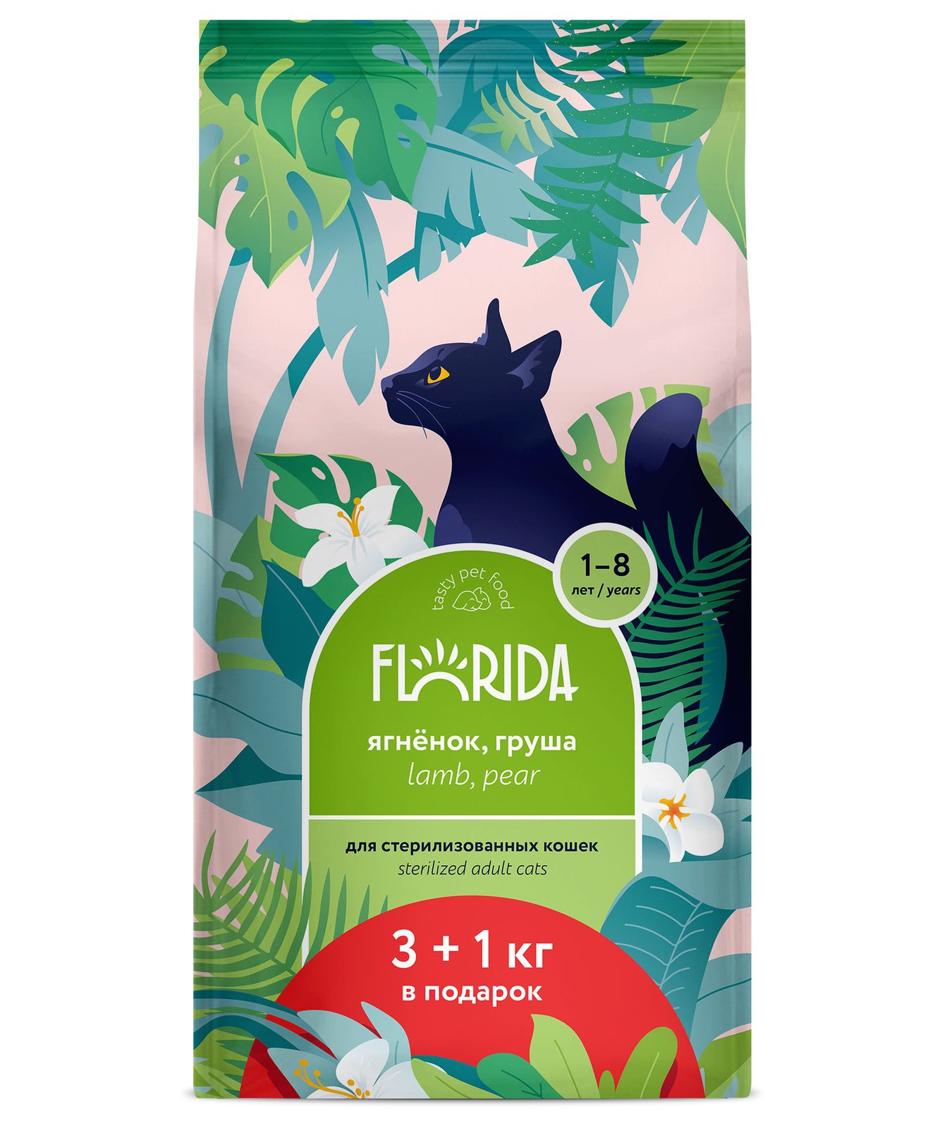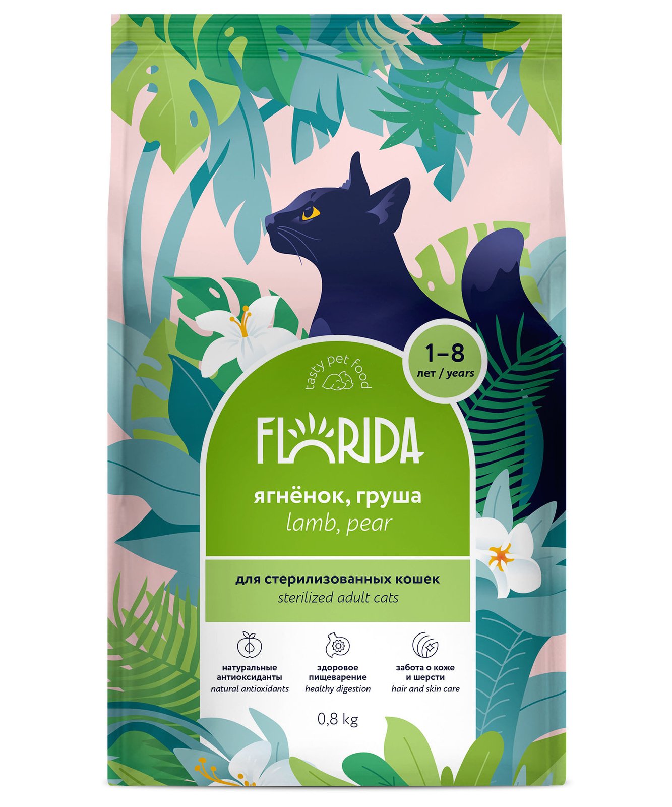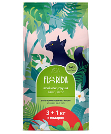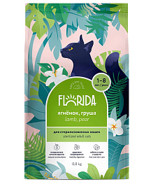 Сухой корм супер-премиум класса Florida с ягненком и грушей для кастрированных котов и стерилизованных кошек в возрасте от 1 до 8 лет.