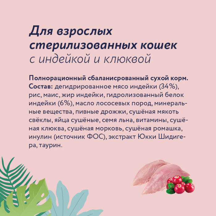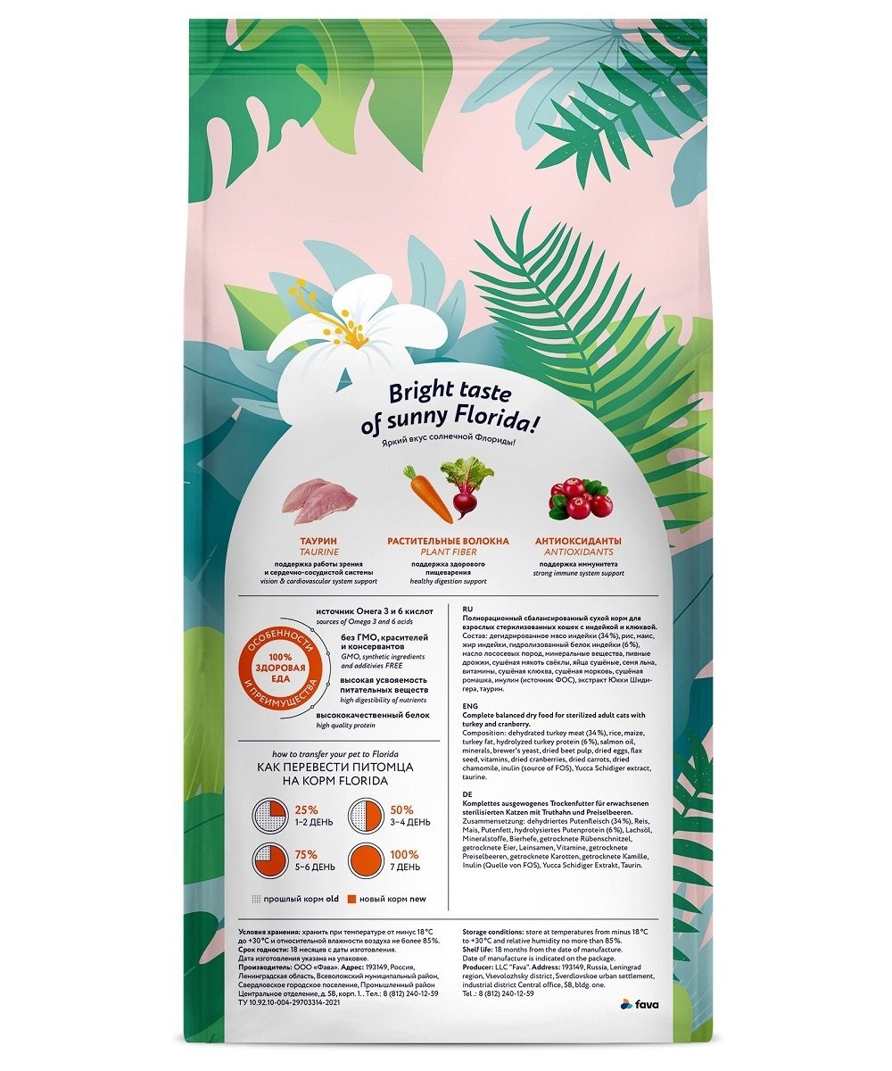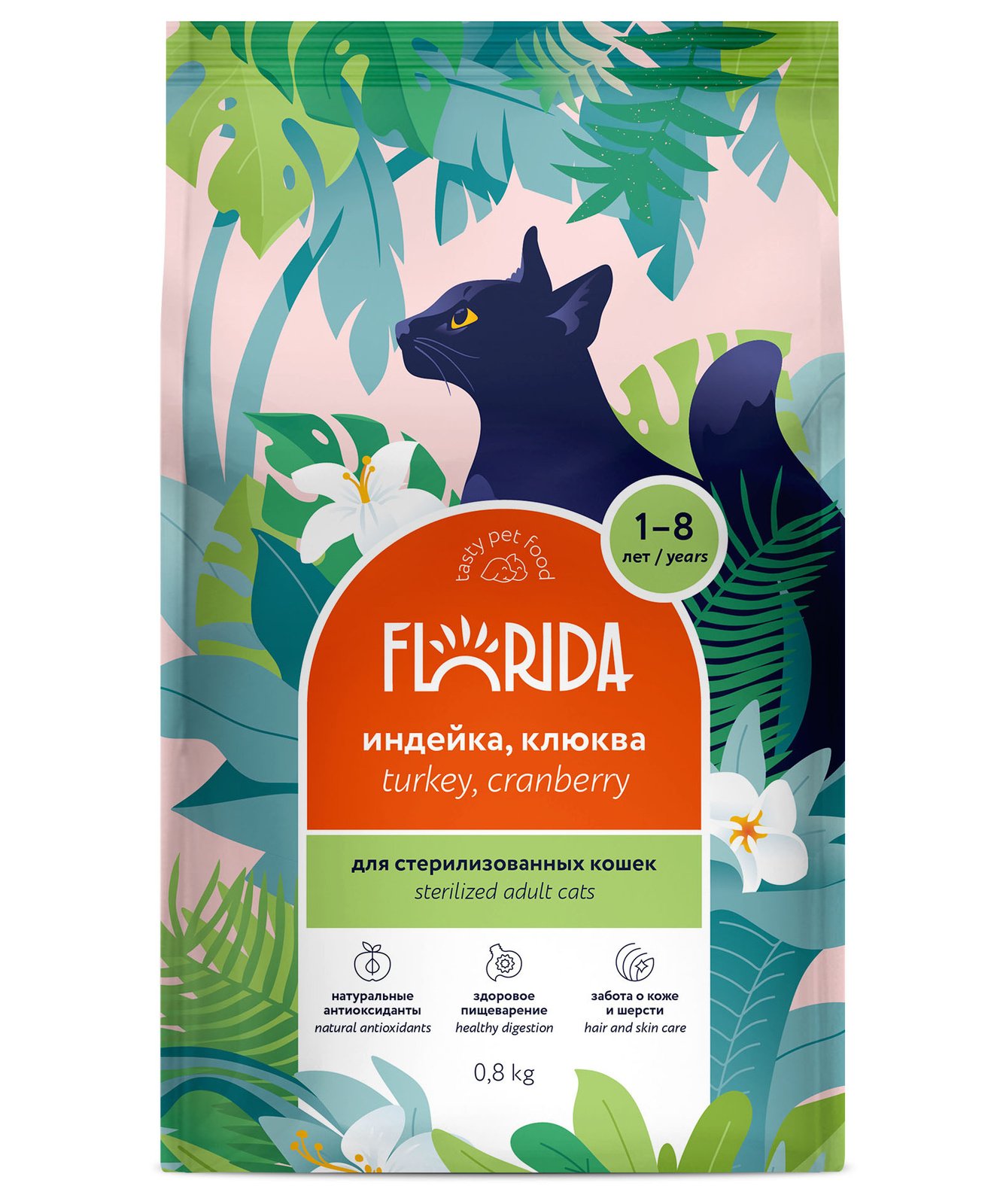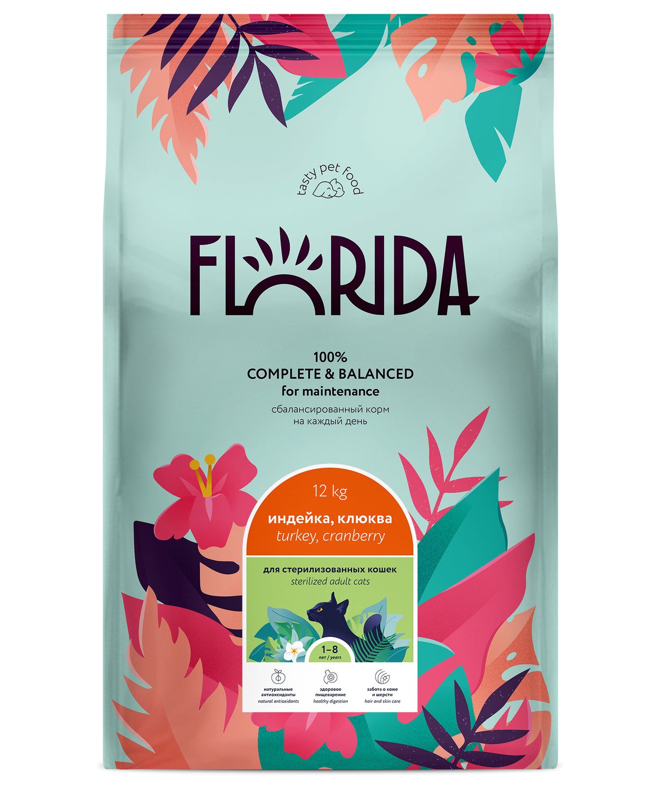 Сухой корм супер-премиум класса Florida с индейкой и клюквой для кастрированных котов и стерилизованных кошек в возрасте от 1 до 8 лет.