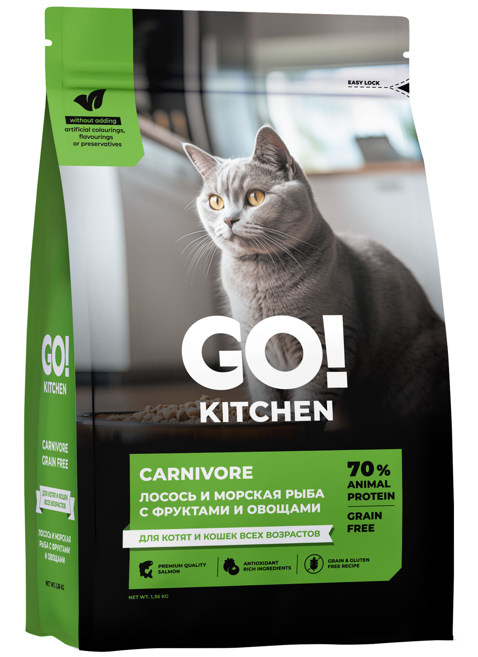 Полнорационный беззерновой сухой корм для котят и кошек всех возрастов с лососем и морской рыбой, фруктами и овощами.