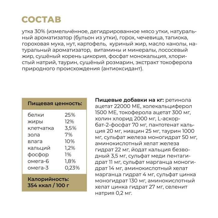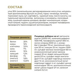 Состав: Утка 30 % (измельченное, дегидрированное мясо утки, натуральный ароматизатор (бульон из утки)), горох, чечевица, тапиока, гороховая мука, нут, картофель, куриный жир, масло канолы, натуральный ароматизатор, витамины и минералы, лососевый жир, сушеный корень цикория, фосфат монокальция, хлористый натрий, таурин, сушеный розмарин, экстракт токоферола природного происхождения (антиоксидант).