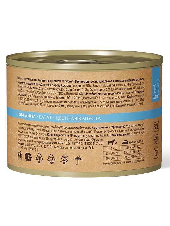 Состав: Говядина (70%), Батат (4%), Цветная капуста (4%), Бульон (17%), Минералы (5%).