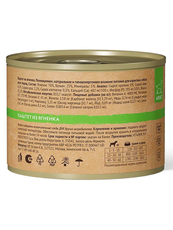 Монопротеиновый влажный корм из ягненка для собак всех пород и всех возрастов с нормальной активностью, чувствительным пищеварением или склонных к аллергии.