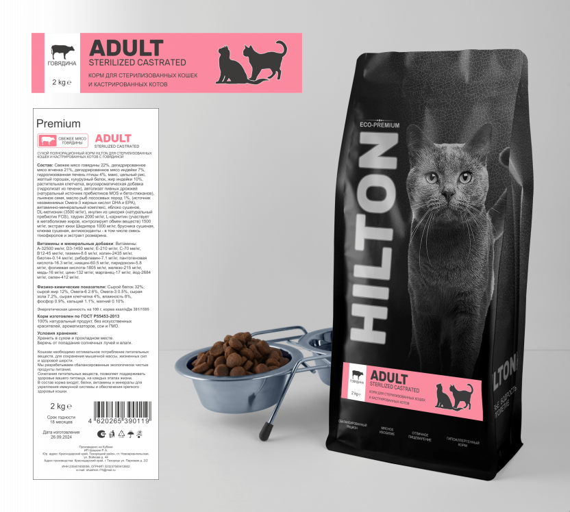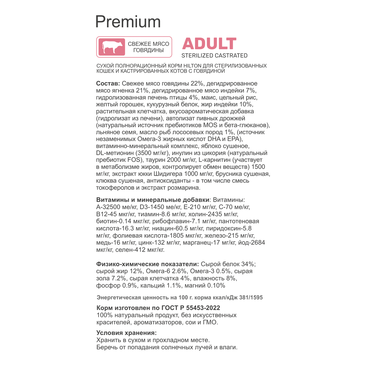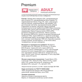 Состав: Мясо говядины 10%, маис, цельный рис, желтый горошек, кукурузный белок, жир индейки, растительная клетчатка, вкусоароматическая добавка (гидролизат из печени), автолизат пивных дрожжей (натуральный источник пребиотиков MOS и бета-глюканов), льняное семя, масло рыб лососевых пород (источник незаменимых Омега-3 жирных кислот DHA и EPA), витаминно-минеральный комплекс, яблоко сушеное, DL-метионин (3500 мг/кг), инулин из цикория (натуральный пребиотик FOS), таурин 2000 мг/кг, L-карнитин (участвует в метаболизме жиров, контролирует обмен веществ) 1500 мг/кг, экстракт юкки Шидигера 1000 мг/кг, брусника сушеная, клюква сушеная, антиоксиданты - в том числе смесь токоферолов и экстракт розмарина.