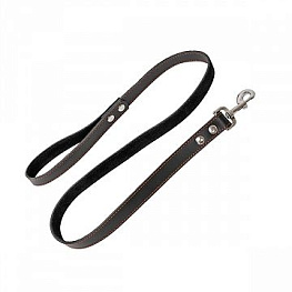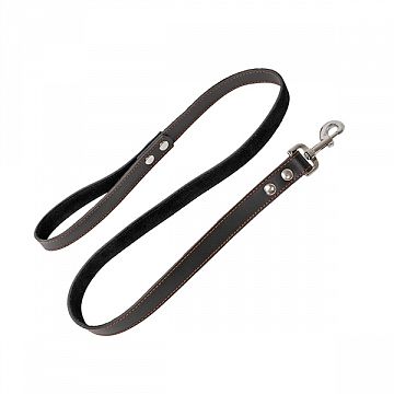 Усиленный кожаный поводок из двух слоев натуральной кожи различной выделки черного цвета с декоративной отстрочкой прочной красной нитью. На конце поводка закреплен соответствующего размера надёжный металлический карабин с фиксацией кнопкой от проверенного производителя, на другом конце - удобная ручка-петля.