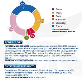 Питательная ценность: сырой белок: 23%, сырая клетчатка: 7%, сырой жир: 17%, сырая зола: 6,3%, сочетание эйкозапентаеновой (EPA) и докозагексаеновой (DHA): 0.84%, линоленовой (LA): 4.35%.
