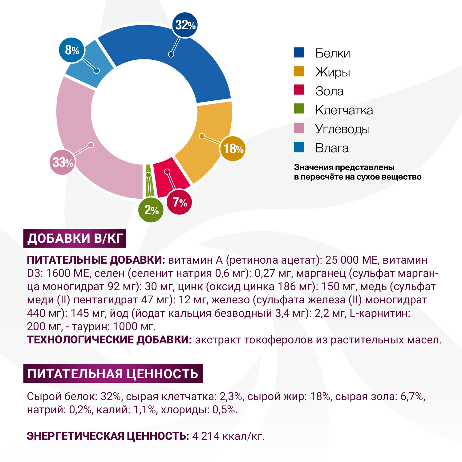 Питательные добавки: витамин А (ретинола ацетат): 25 000 МЕ, витамин D3: 1600 МЕ, селен (селенит натрия 0,27 мг): 0,16 мг, марганец (сульфат марганца моногидрат 77 мг): 25 мг, медь (сульфат меди (II) пентагидрат 39 мг): 10 мг, железо (сульфата железа (II) моногидрат 249 мг): 82 мг, йод (йодат кальция безводный 7.3 мг): 4.8 мг, L-карнитин: 200 мг, - таурин: 1000 мг.