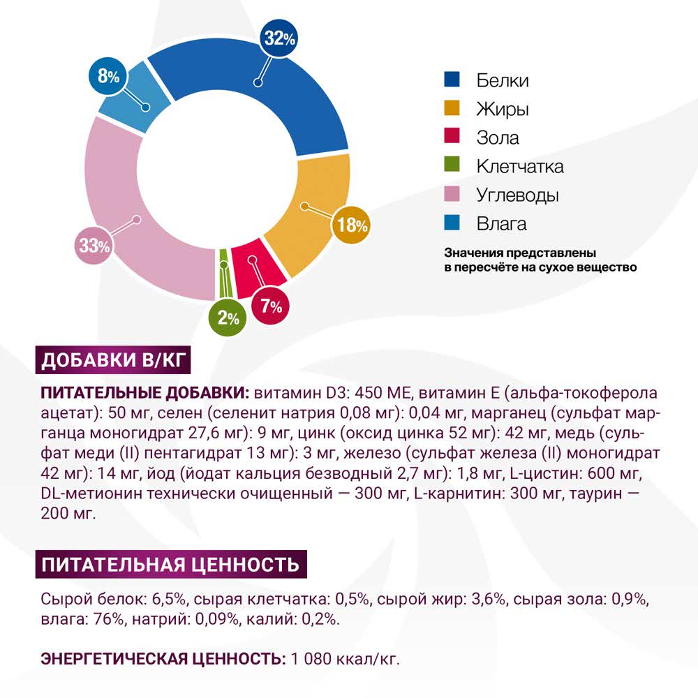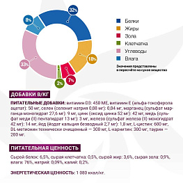 Питательные добавки на кг: витамин D3: 450 МЕ, витамин Е (альфа-токоферола ацетат): 50 мг, селен (селенит натрия 0,08 мг): 0,04 мг, марганец (сульфат марганца моногидрат 27,6 мг): 9 мг, цинк (оксид цинка 52 мг): 42 мг, медь (сульфат меди (II) пентагидрат 13 мг): 3 мг, железо (сульфат железа (II) моногидрат 42 мг): 14 мг, йод (йодат кальция безводный 2,7 мг): 1,8 мг, L-цистин: 600 мг, DL-метионин технически чистый - 300 мг, L-карнитин: 300 мг, таурин – 200 мг.