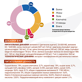 Питательная ценность: сырой белок: 19%, сырая клетчатка: 3,7%, сырой жир: 19%, сырая зола: 5,7%, кальций: 0,6%, фосфор: 0,36%, натрий: 0,18%, магний: 0,06%, калий: 0,9%, хлориды: 0,6%, сера: 0,1%, общее содержание витамина D: 1700 МЕ/кг, гидроксипролин: 0%, общее содержание серных аминокислот: 0,6%, Омега-3 жирные кислоты: 0,65%, Омега-6 жирные кислоты: 3,85%. Подщелачивающий мочу компонент: цитрат калия 1,1%.