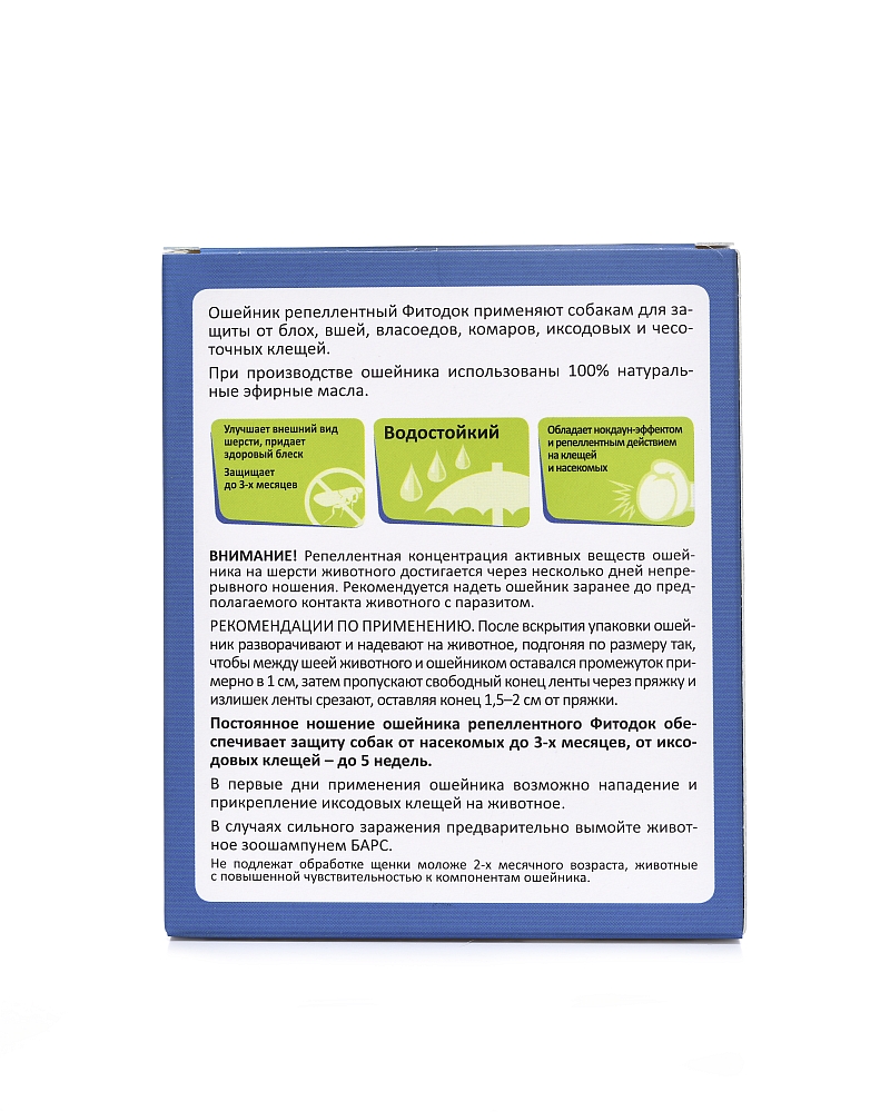 Ошейник репеллентный «Фитодок» применяют собакам и кошкам для защиты от блох, вшей, власоедов, комаров, иксодовых и чесоточных клещей. Ошейник надевают на животное, оставляя между шеей и ошейником зазор в 1,0 см, затем свободный конец ленты пропускают через фиксатор и излишек срезают, оставляя конец в 1,5–2 см. Постоянное ношение репеллентного ошейника «Фитодок» обеспечивает защиту собак и кошек от насекомых до 3-х месяцев, от иксодовых клещей до 5 недель.