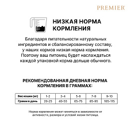 Аналитические составляющие: Сырой белок 36,0%; Сырой жир 11,0%; Сырая клетчатка 3,0%; Сырая зола 6,5%; Влага 6,0%; Кальций (Са) 1,4%; Фосфор (P) 0,9%; Магний (Mg) 0,08%; Натрий (Na) 0,5%; Омега 3 жирные кислоты 0,5%; Омега 6 жирные кислоты 1,2%. Метаболическая энергия: 3658 ккал/кг. Пищевые добавки: Витамин A (3a672a) 20000 МЕ/кг; Витамин D3 (3a671) 1750 МЕ/кг; Витамин Е (3a700) 200 мг/кг; Витамин K3 (3a711) 4 мг/кг; Витамин B1 (3a821) 10 мг/кг; Витамин B2 (3a825i) 8 мг/кг; Витамин B6 (3a831) 8 мг/кг; Витамин B12 (цианокобаламин) 50 мкг/кг; Кальций-D-пантотенат (3a841) 16,5 мг/кг; Фолиевая кислота (3a316) 5 мг/кг; Биотин (3a880) 200 мкг/кг; Таурин (3a370) 1500 мг/кг; Ниацин (3a315) 80 мг/кг; DL-метионин (3c301) 5,000 мг/кг; L-триптофан (3c440) 600 мг/кг. Микроэлементы: Медь (3b405) 5 мг/кг; Цинк (3b605) 50 мг/кг; Марганец (3b503) 5 мг/кг; Йод (3b202) 1,5 мг/кг; Селен (3b801) 0,2 мг/кг. Антиоксиданты: богатые токоферолом экстракты из растительных масел (1b306(i)) 1,000 мг/кг.