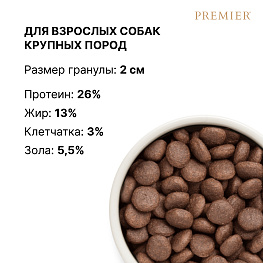 Аналитические составляющие: Сырой протеин 26,0%; Сырой жир 13,0%; Сырая клетчатка 3,0%; Сырая зола 5,5%; Влага 9,0%; Кальций (Са) 0,9%; Фосфор (P) 0,6%; Омега 3 жирные кислоты 0,6%; Омега 6 жирные кислоты 1,6%. Метаболическая энергия: 3702 ккал/кг. Пищевые добавки: Витамин A (3a672a) 15000 МЕ/кг; Витамин D3 (3a671) 1500 МЕ/кг; Витамин Е (3a700) 150 мг/кг; Витамин B1 (3a821) 2 мг/кг; Витамин B2 (3a825i) 5,5 мг/кг; Витамин B6 (3a831) 1,5 мг/кг; Витамин B12 (цианокобаламин) 38 мкг/кг; Кальций-D-пантотенат (3a841) 13 мг/кг; Фолиевая кислота (3a316) 0,3 мг/кг; Таурин (3a370) 1500 мг/кг; Ниацин (3a315) 18,4 мг/кг. Микроэлементы: Железо (3b103) 50 мг/кг; Медь (3b405) 10 мг/кг; Цинк (3b605) 62 мг/кг; Марганец (3b503) 10 мг/кг; Йод (3b202) 1,5 мг/кг; Селен (3b801) 0,2 мг/кг. Антиоксиданты: богатые токоферолом экстракты из растительных масел (1b306(i)) 1,000 мг/кг.
