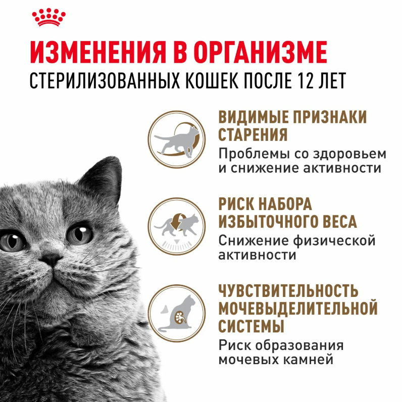 Эйджинг стерилайзд: сухой корм для стерилизованных кошек в возрасте старше 12 лет. 30% кошек старше 12 лет имеют избыточный вес.