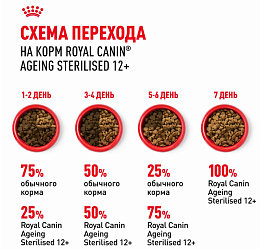 | Смешанное кормление | 24 г + 1 пауч “Royal Canin Ageing 12+” | 34 г + 1 пауч “Royal Canin Ageing 12+” | 44 г + 1 пауч “Royal Canin Ageing 12+” | 52 г + 1 пауч “Royal Canin Ageing 12+” |