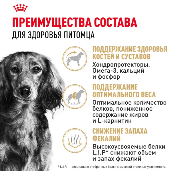 Также ROYAL CANIN® Dachshund Adult способствует уменьшению объема и запаха стула.