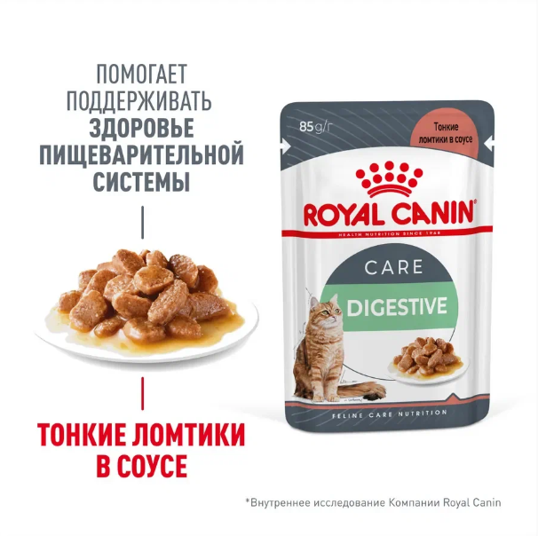 ROYAL CANIN® Digest Sensitive в соусе – высокоусвояемое питание для кошек с чувствительной пищеварительной системой. Белки LIP в составе способствуют уменьшению запаха фекалий.