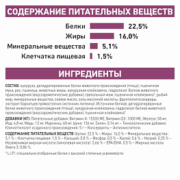 кукуруза, дегидратированные белки животного происхождения (птица), пшеничная мука, рис, пшеница, животные жиры, кукурузная клейковина, гидролизат белков животного происхождения (вкусоароматические добавки), свекольный жом, пшеничная клейковина*, рыбий жир, минеральные вещества, соевое масло, соль масляной кислоты, фруктоолигосахариды, экстракт бархатцев прямостоячих (источник лютеина). Источники белков: дегидратированные белки животного происхождения (птица), кукурузная клейковина, гидролизат белков животного происхождения (вкусоароматические добавки), пшеничная клейковина*.
