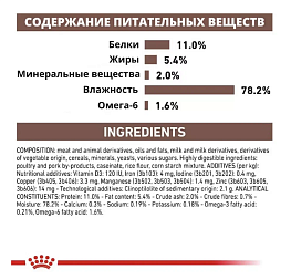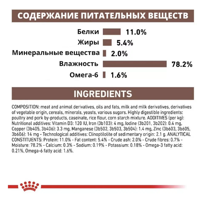 Состав: субпродукты птицы , побочные продукты свинины , куриное мясо , казеинат , рафинированное подсолнечное масло, продукты из свиной крови , порошок целлюлозы, минеральные вещества, смесь кукурузного крахмала , побочные продукты гидролизованной птицы , рыбий жир, рисовая мука, дрожжи и их часть, экстракт календулы (источник лютеина). Добавки на кг: витамин D3: 125 МЕ, железо (3b103): 4 мг, йод (3b202): 0,41 мг, медь (3b405, 3b406): 3,3 мг, марганец (3b502, 3b503, 3b504): 1,4 мг, цинк (3b603, 3b605, 3b606) ): 14 мг. Аналитический состав: сырая зола: 2%. сырая клетчатка: 0,7%. жир сырой нефти: 5,4%. влага: 78,3%. белок: 11%.