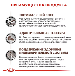 Высокоусвояемая формула со сбалансированными волокнами, включая пребиотики, для поддержания здорового пищеварения. Высокоэнергетическая формула с адаптированными уровнями питательных веществ (включая белок и кальций) для удовлетворения потребностей растущего котенка. Мягкая текстура мусса для облегчения приема пищи у котят с пониженным аппетитом и содействия переходу от молока к твердой пище.