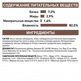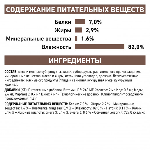 Состав: Мясо и мясные субпродукты, подсолнечное масло, продукты животного происхождения, кукурузная мука, витамины и минеральные вещества, загустители, аминокислоты (в том числе таурин), продукты растительного происхождения (в том числе растительная клетчатка), рыбий жир, маннанолигосахариды, сахара, краситель, экстракт бархатцев прямостоячих (источник лютеина). Источники легкоусвояемых ингредиентов: мясные субпродукты, кукурузная мука.