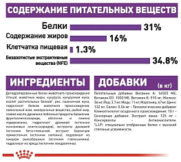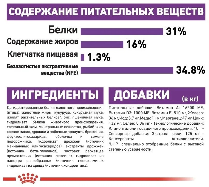 дегидратированные белки животного происхождения (птица), мука из зерновых культур, рис, изолят растительных белков*, пшеница, животные жиры, растительная клетчатка, гидролизат белков животного происхождения (вкусоароматические добавки), минеральные вещества, рыбий жир, соевое масло, дрожжи и побочные продукты брожения, оболочка и семена подорожника, фруктоолигосахариды, гидролизат дрожжей (источник мaннановых олигосахаридов), экстракты дрожжей (источник бета-глюканов), экстракт бархатцев прямостоячих (источник лютеина), гидролизат из панциря ракообразных (источник глюкозамина), гидролизат из хряща (источник хондроитина).