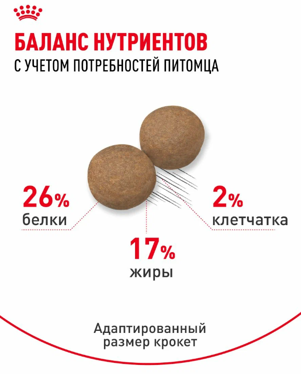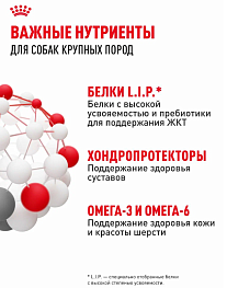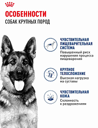 Продукт ROYAL CANIN® Maxi Adult предназначен для крупных собак (вес взрослой собаки от 26 до 44 кг) в возрасте от 15 месяцев и разработан с учетом их потребностей в питательных веществах.