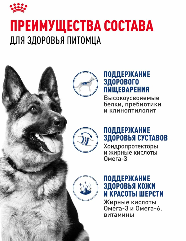 Формула продукта ROYAL CANIN® Maxi помогает поддерживать здоровое пищеварение, а также обогащена жирными кислотами омега-3 (ЭПК и ДГК) для здоровья кожи.