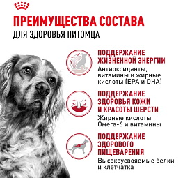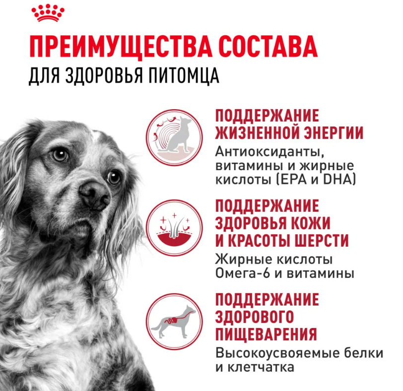 Также ROYAL CANIN® Medium Adult 7 + обогащен жирными кислотами ЭПК и ДГК для поддержания здоровья кожи вашей собаки и идеального состояния ее шерсти.