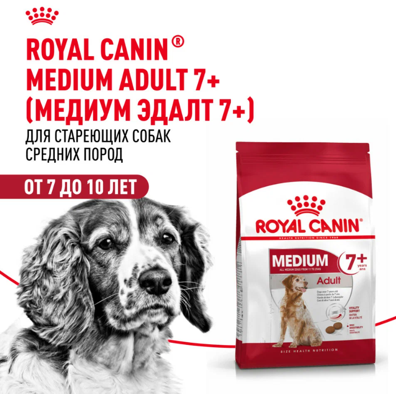 Медиум эдалт 7+: сухой корм для собак в возрасте 7 лет и старше. MEDIUM Adult 7+ удовлетворяет особые потребности собак средних размеров (весом от 11 до 25 кг) в зрелом возрасте.