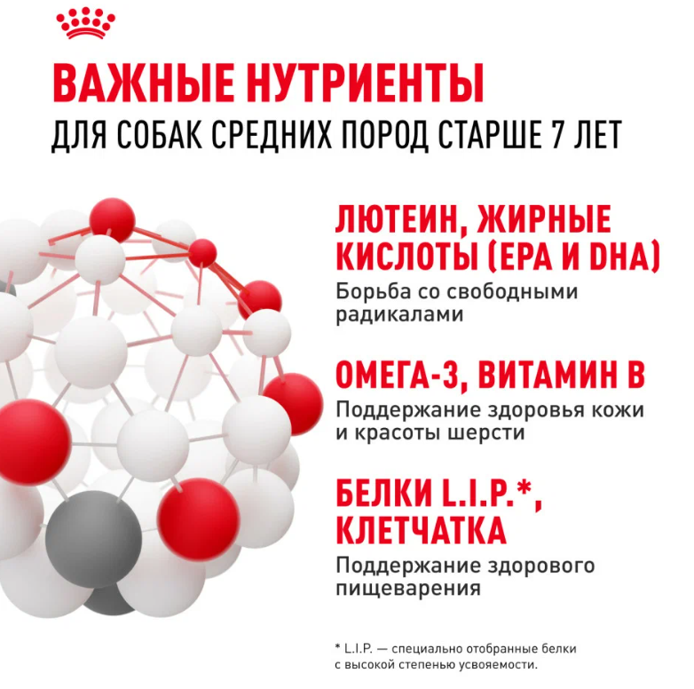 ROYAL CANIN® Medium Adult 7+ содержит эксклюзивный комплекс антиоксидантов для нейтрализации действия свободных радикалов и и предотвращения поялвения признаков раннего старения.
