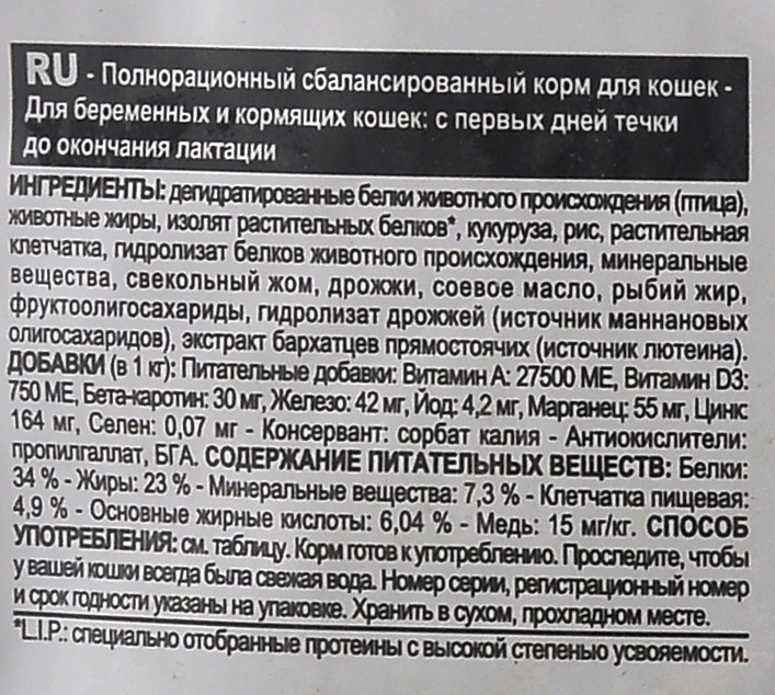 Состав: дегидратированное мясо домашней птицы, животный жир, рис, изолят растительного белка, клетчатка, кукуруза, гидролизат животного белка*, животный белок*, дрожжи, свекольный жом, соевое масло, L-лизин, рыбий жир, минеральные вещества, фруктоолигосахариды (ФОС), яичный порошок, натрия фосфат, гидролизат экстракта дрожжей (источник манноолигосахаридов), DL-метионин, таурин, экстракт бархатцев прямостоячих (богат лютеином), бета-каротин, L-карнитин.